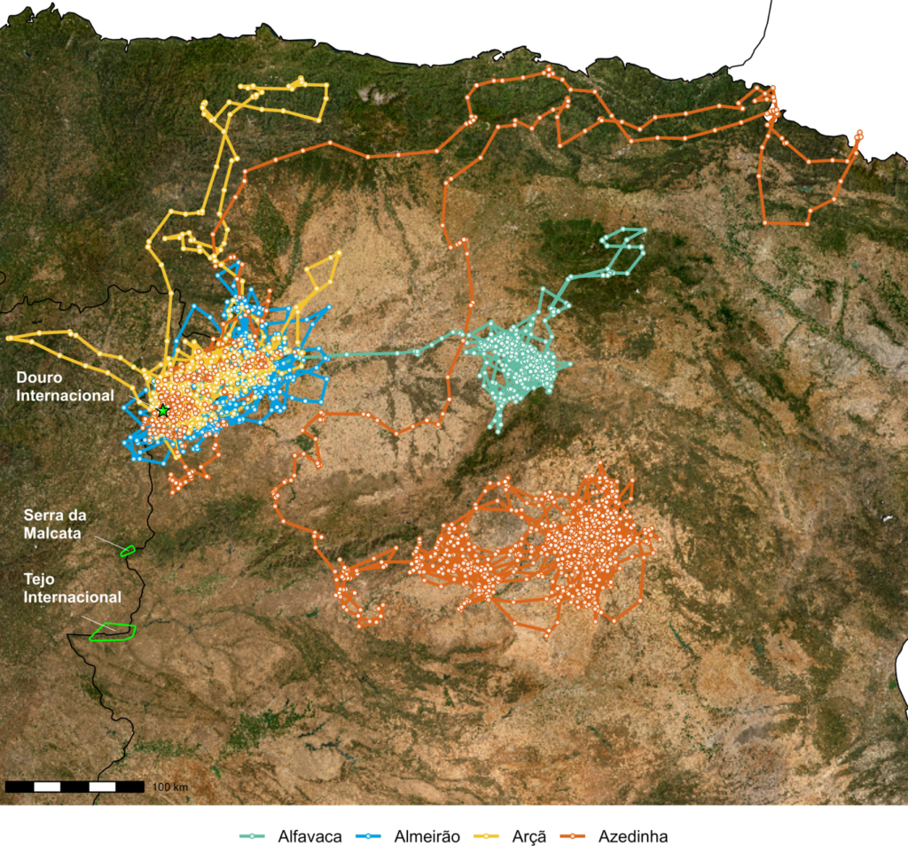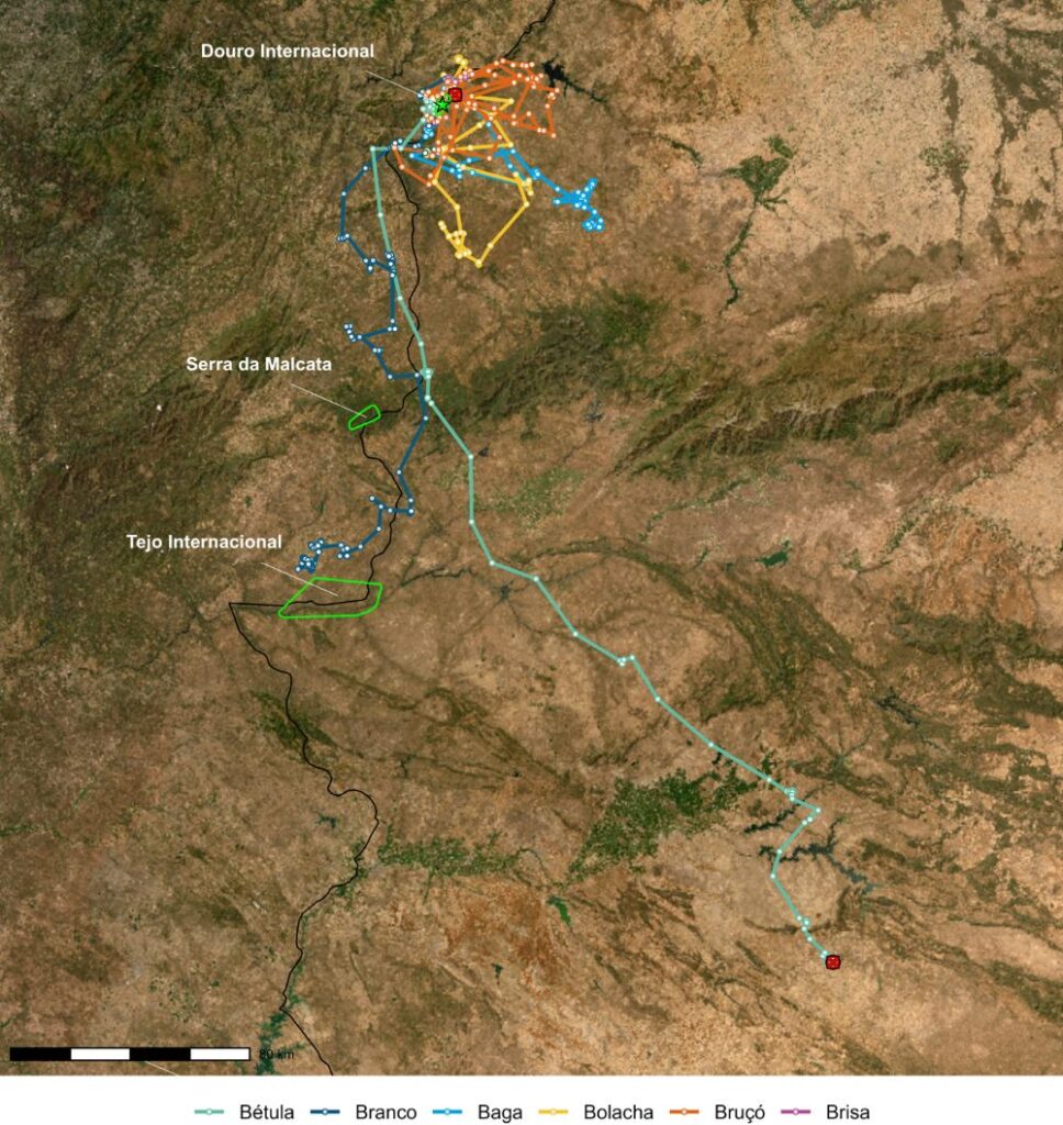 Since their release, they have remained relatively close to the Douro region, and have made a few visits to Spanish territory. One individual, Branco, ventured further south, towards the breeding colony of the Tejo Internacional. Bétula flew to Andalusia, from where it did not return.