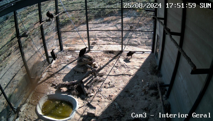 The Douro Internacional acclimatisation station was inaugurated in May 2024 with four juvenile Cinereous Vultures rescued from various parts of the country and rehabilitated in different Wildlife Rehabilitation Centres. Six months later, in November, the aviary was opened and the vultures were free to leave. However, they only left after a curious episode, encouraged by a wild Griffon Vulture (Gyps fulvus) and another Cinereous Vulture from the outside.
